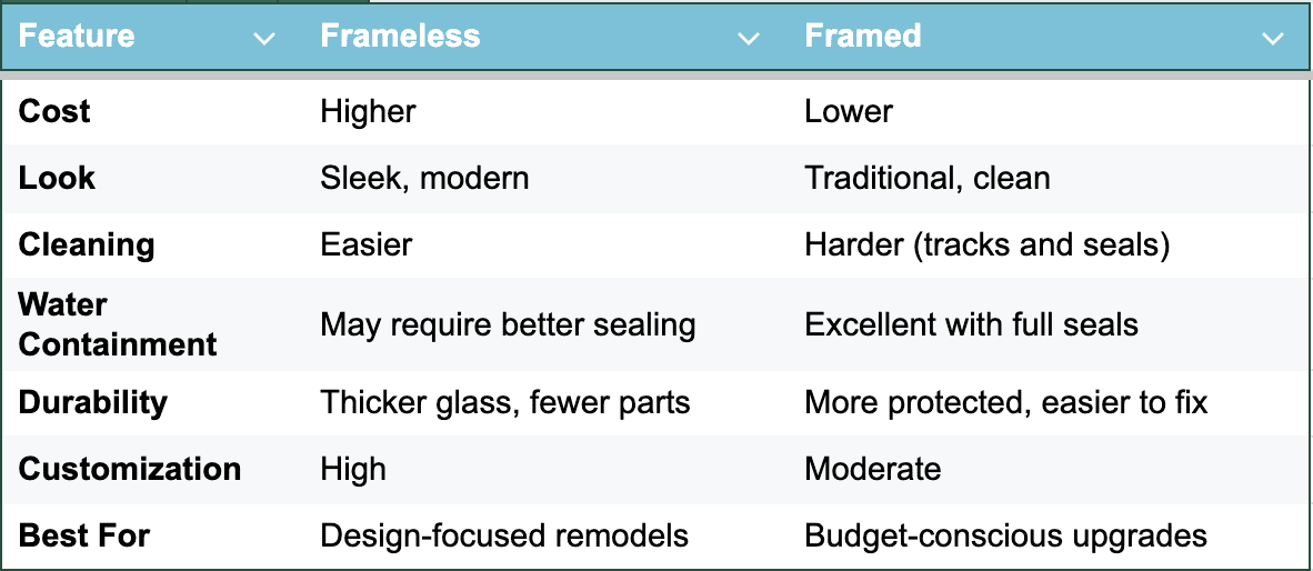 Frameless vs. Framed Showers: Side-by-Side Comparison Table